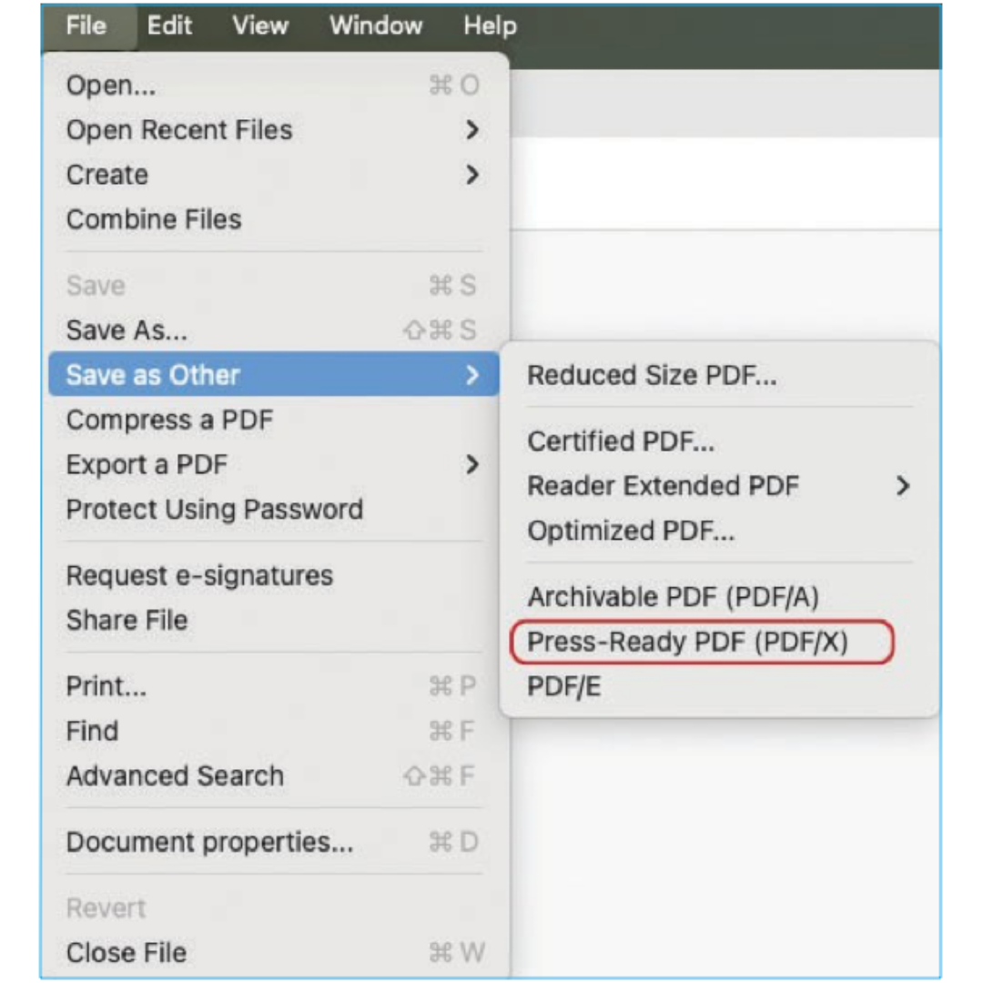 A PDF/X file is a safer, print-ready file of your PDF that helps commercial printers produce your job accurately the first time. Think of PDF/X as a “locked” version of your PDF that prevents fonts, colors, or images from changing during printing. The good news: Adobe Acrobat Pro can do most of the work of converting your PDF automatically.